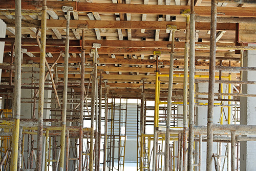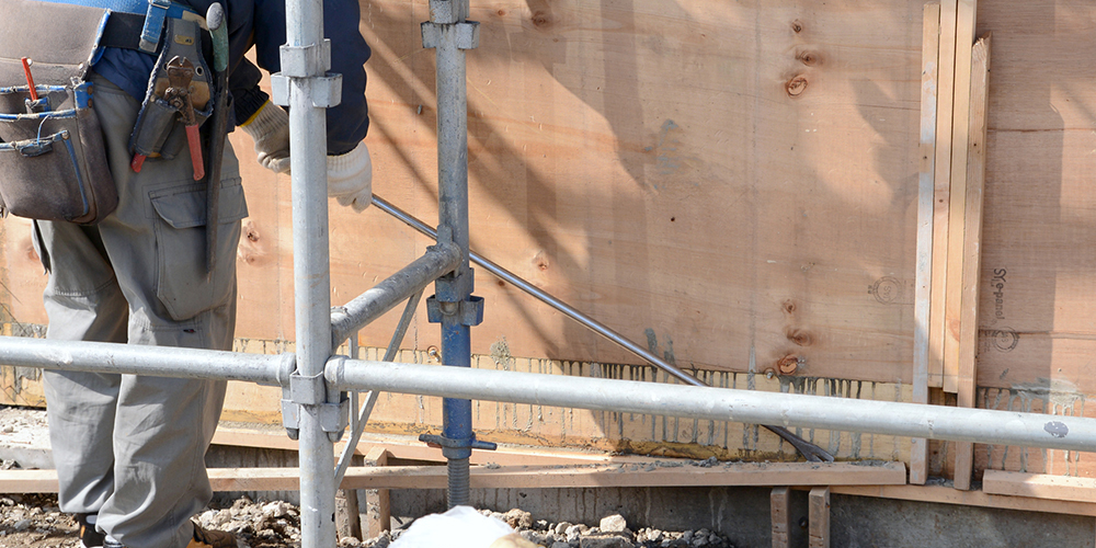 サポートを外して、大引き材(バタ角パイプ)を解体します。続いて天井のベニヤを剥がし、脱型した材料をトラックに積み込み、置き場に返します。